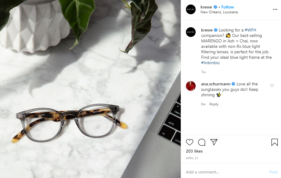 KREWE is a fashion eyewear brand. With so many people working from home and staring at screens all day, They saw an opportunity to provide customers with something that would be relevant and useful to them at this time. So, they launched a segment of blue-light lenses to help protect themselves from digital eye strain.